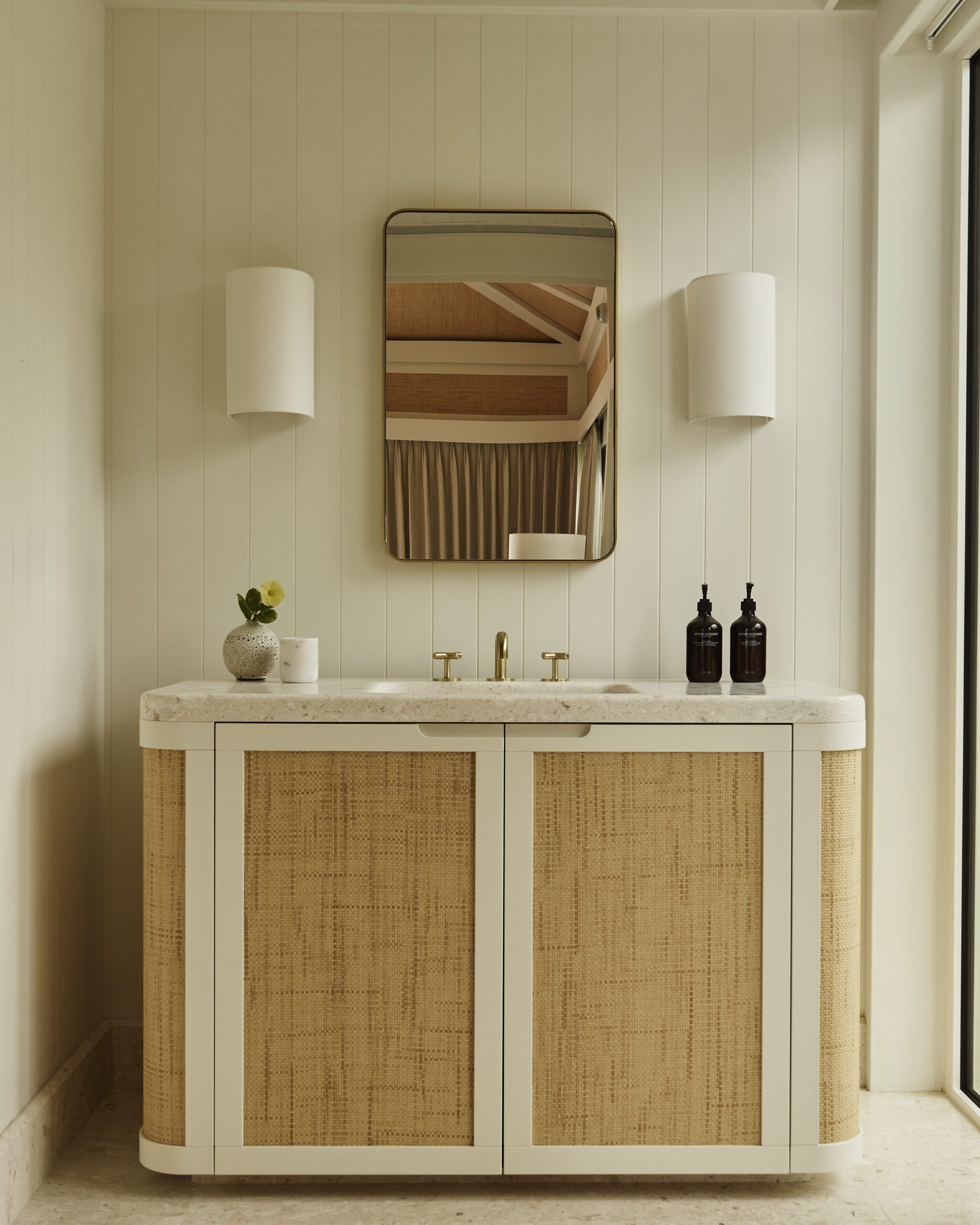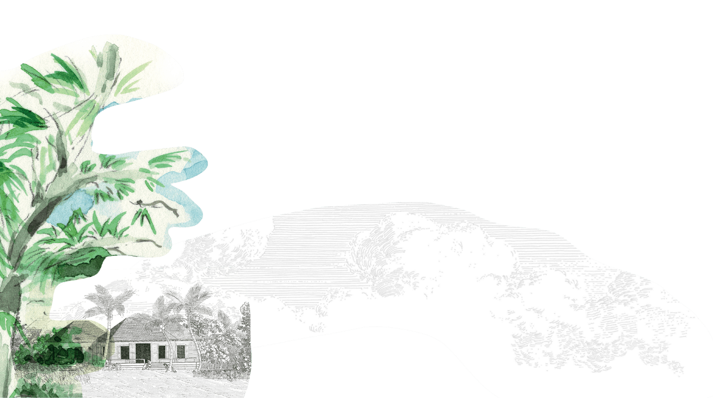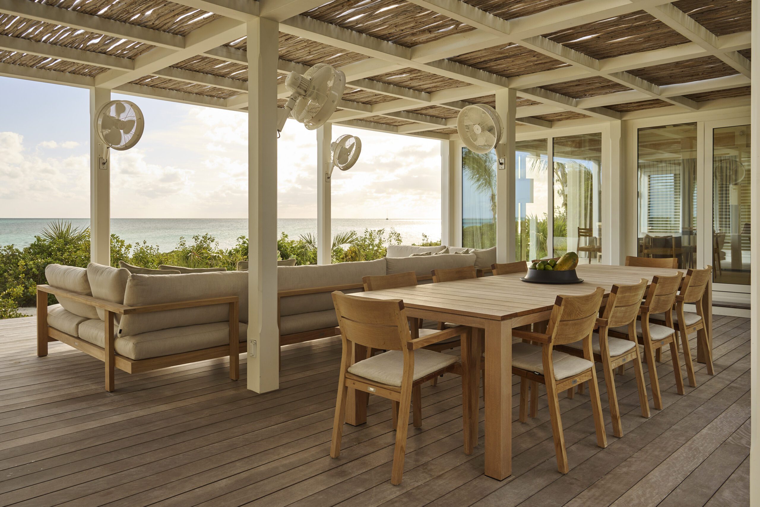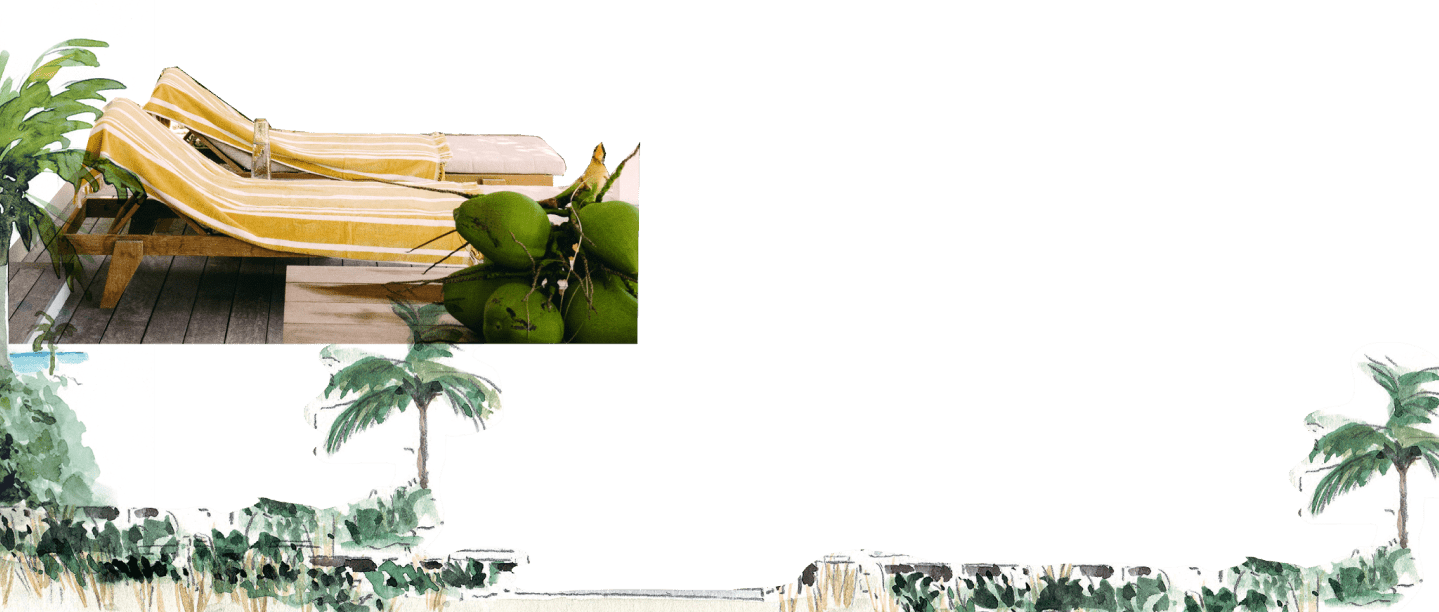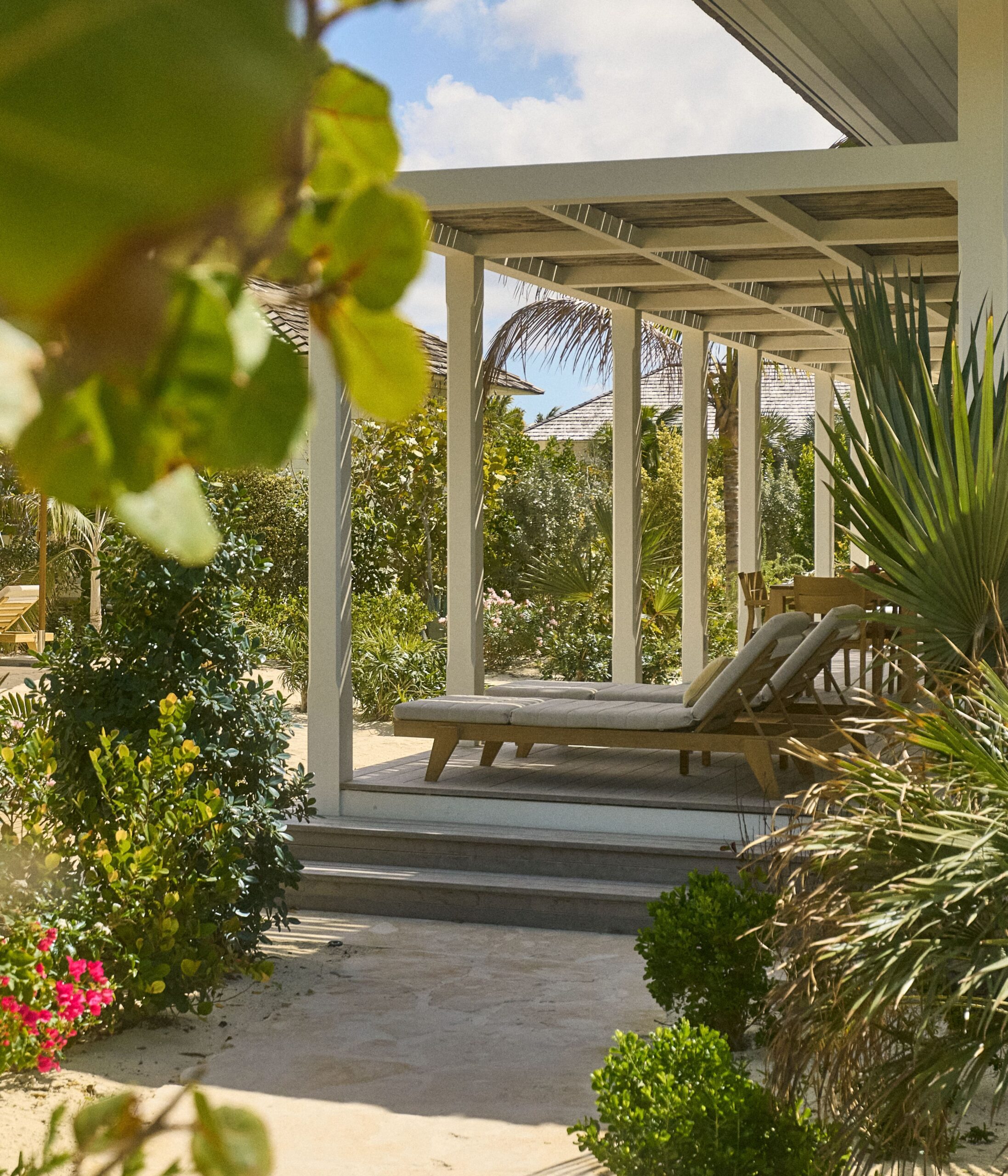 The Two Bedroom Villa features a Bungalow with Primary and Guest bedrooms, each with ensuite bath, connected to a Living Pavilion through a shaded outdoor porch with direct views to the sea. The Living Pavilion is an open-plan Bungalow outfi tted with a kitchen, a dining space for up to ten guests, and a living area, as well as outdoor lounging and dining space, and a powder room.