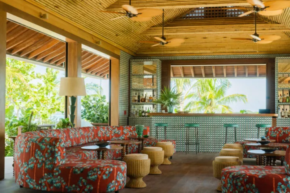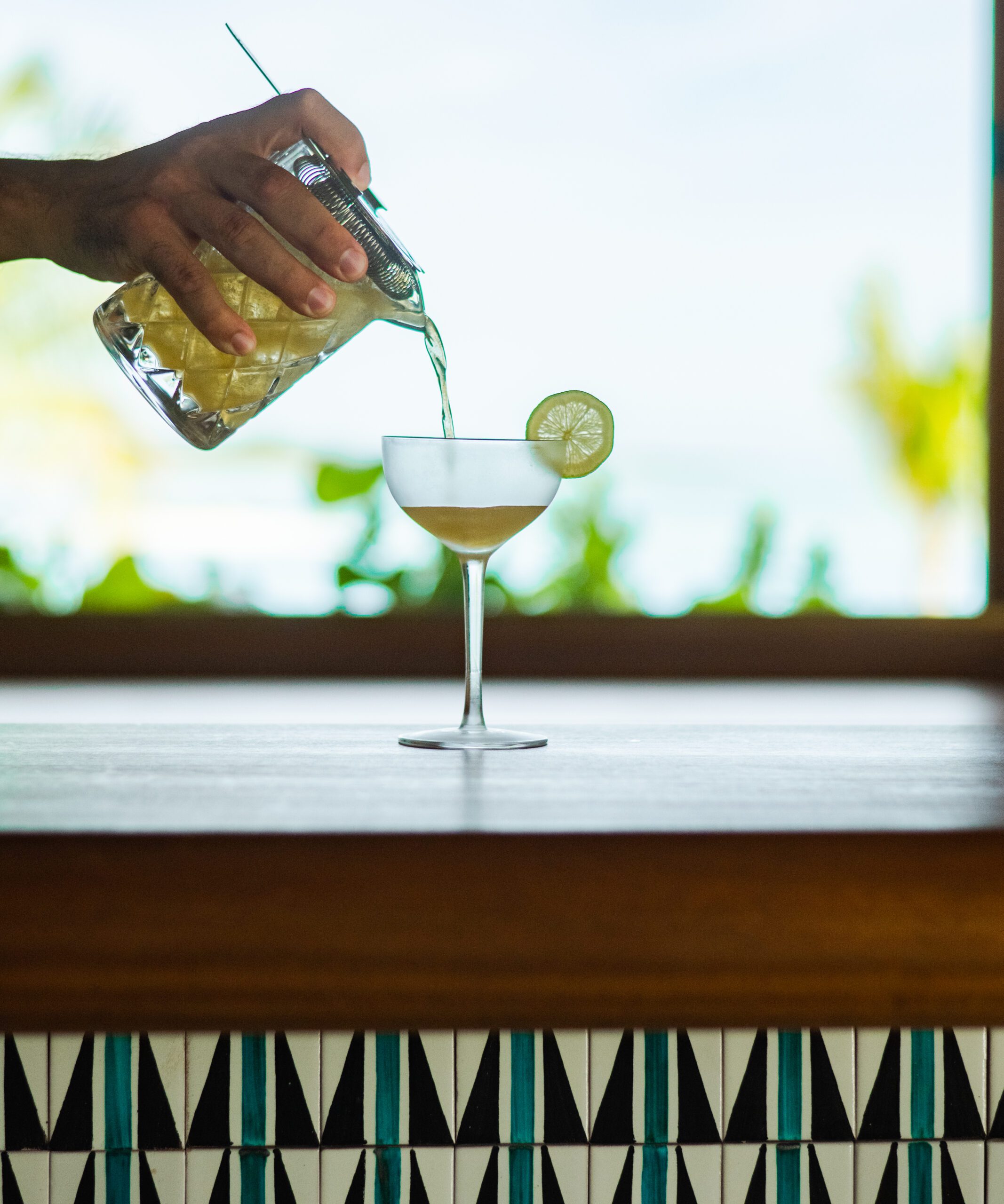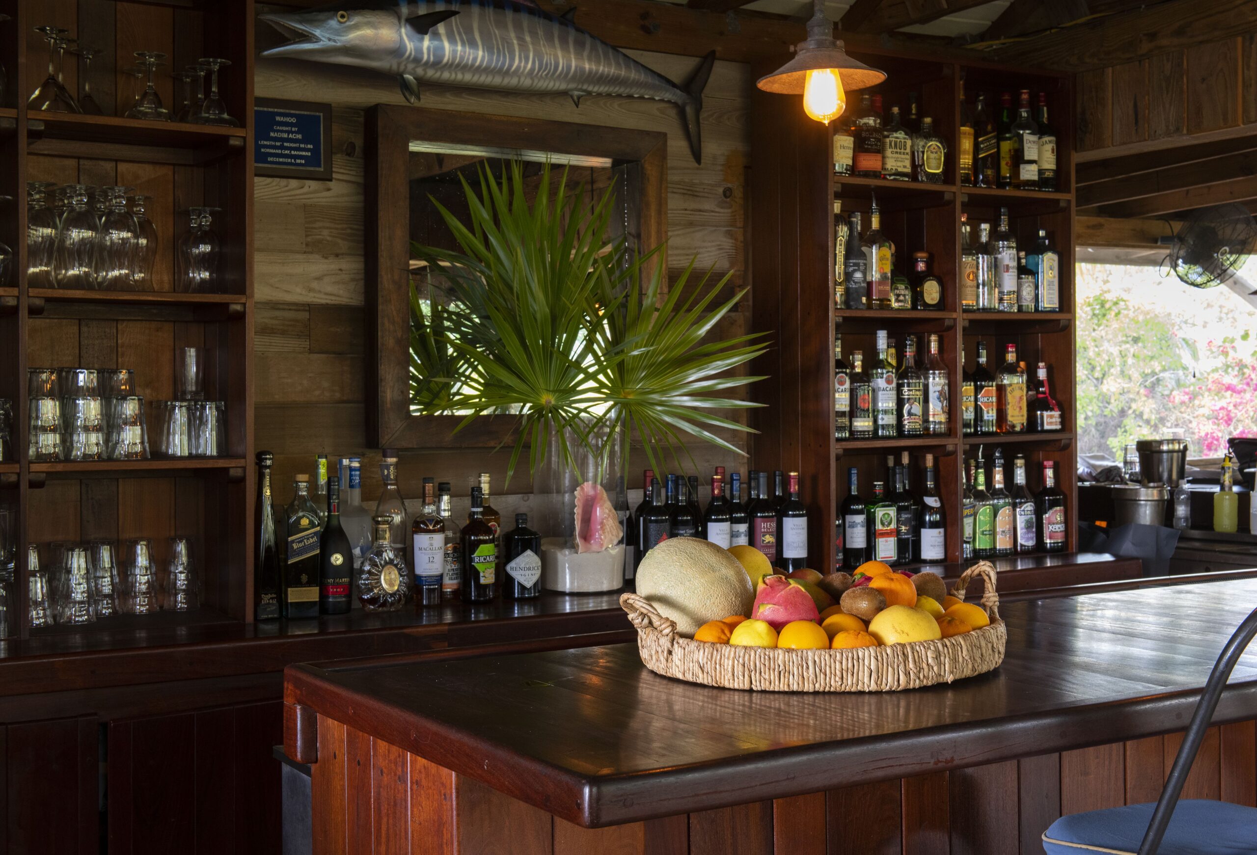 The Norman’s Cay Yacht Club sits on the highest point of the island: a beacon for all visitors to gather and experience 360° views of the waters surrounding the cay. Here one can enjoy drinks, dining, entertainment, and be spellbound by the island spirit. The openness of the club is quite literally sensational: open-aired with bamboo-lined walls that frame the green foliage and blue waters, furniture upholstered with corals and native sea grapes. Follow the coral stone stairs up to the terrace and start with a seat at the bar, hand-painted with geometric tiles that recall the Bahamian flag.