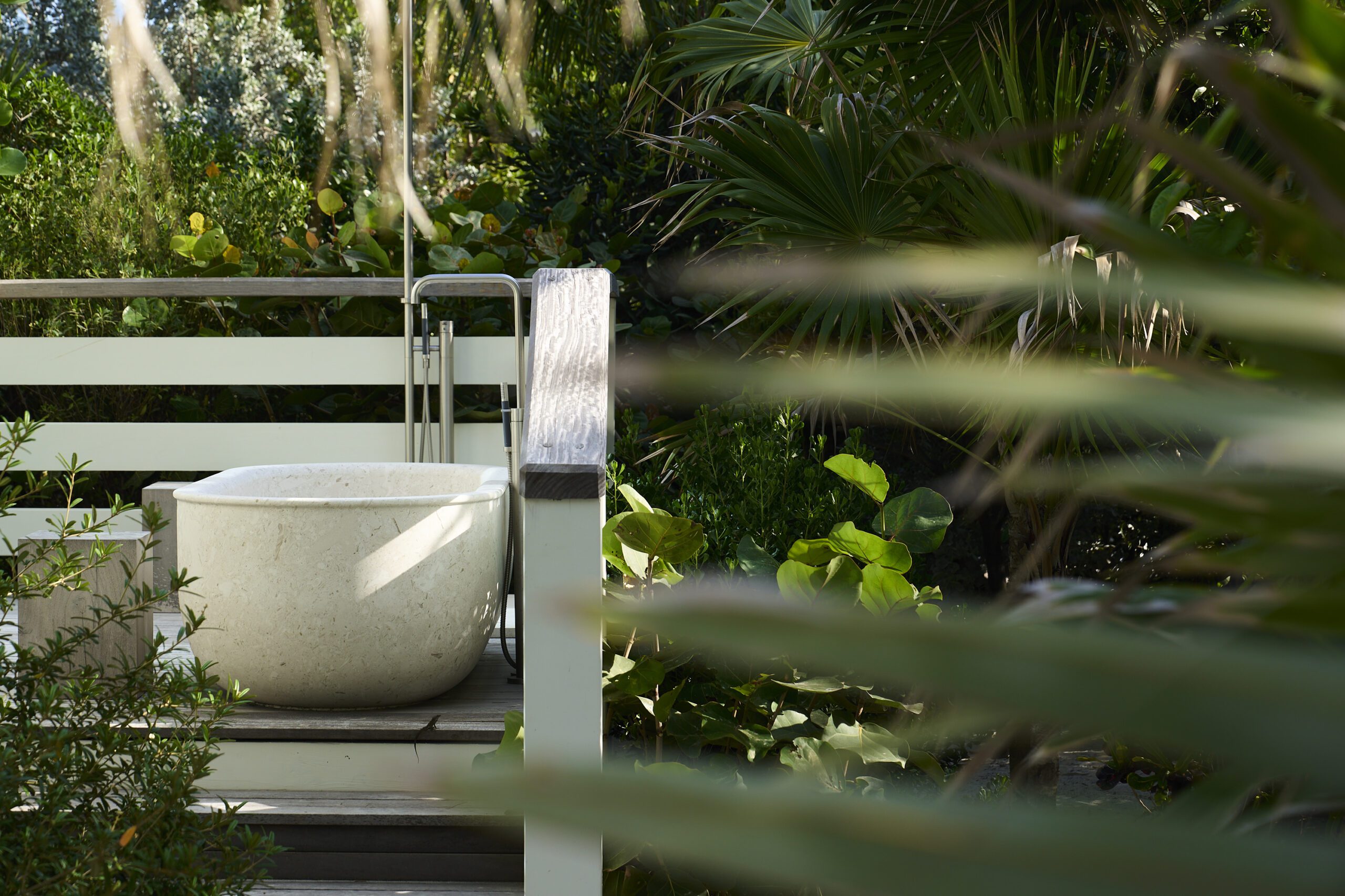 The Beach Club sits on the eastern shore of the island, on a corner shaded by canopies of casuarina pines. Here where the land meets the beach, the soft swells invite guests to swim ashore and stop for a bite or a drink at the mosaic bar nestled between the trees. Crafted from Murano glass tiles, the bar portrays an undersea vision of coral and marine life in verdant and sunny colors, inviting guests to discover this casual outpost at the water’s edge